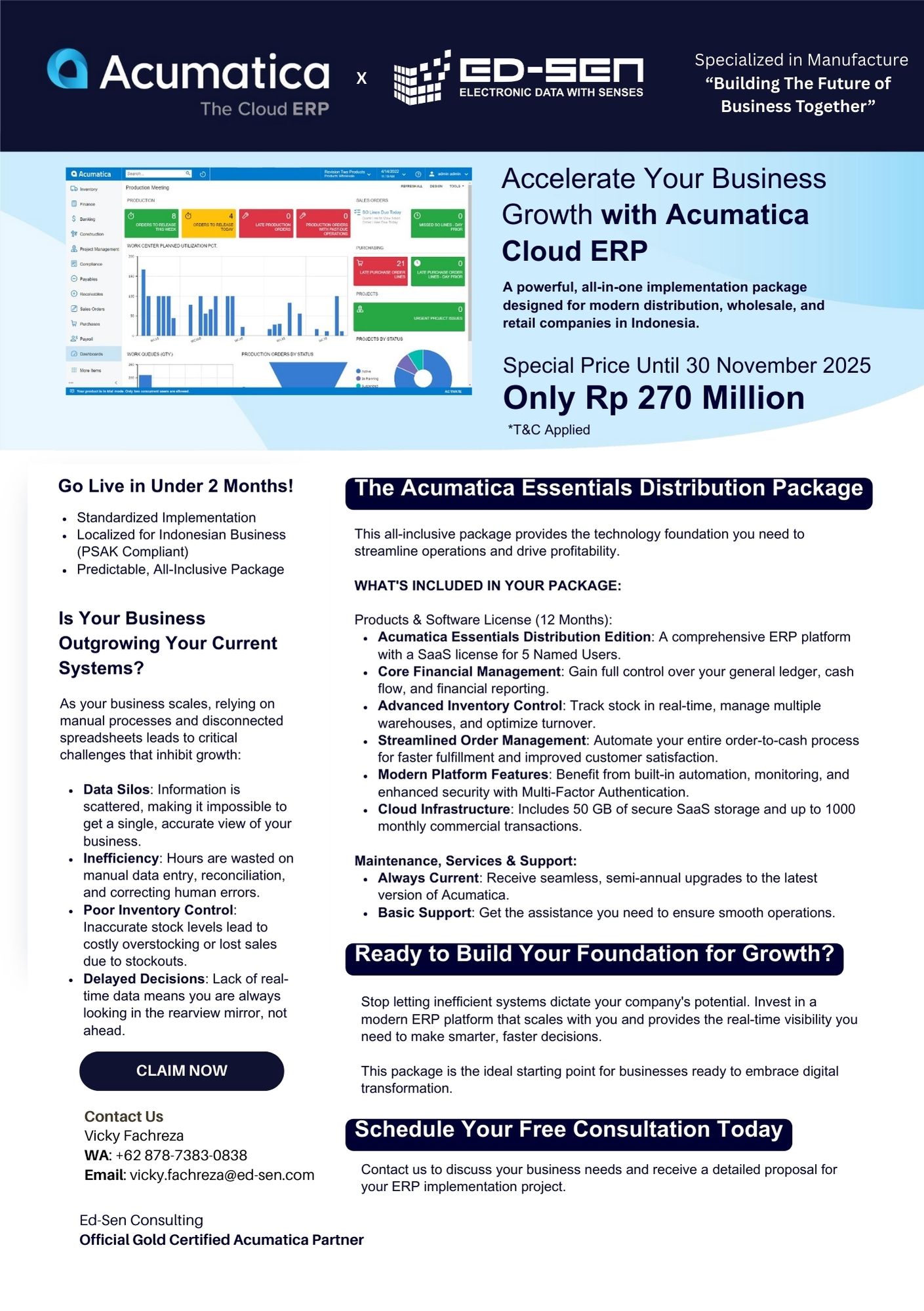 Contact Ed-Sen Consulting now to claim your Acumatica Essentials Distribution Package for only Rp 270 Million.